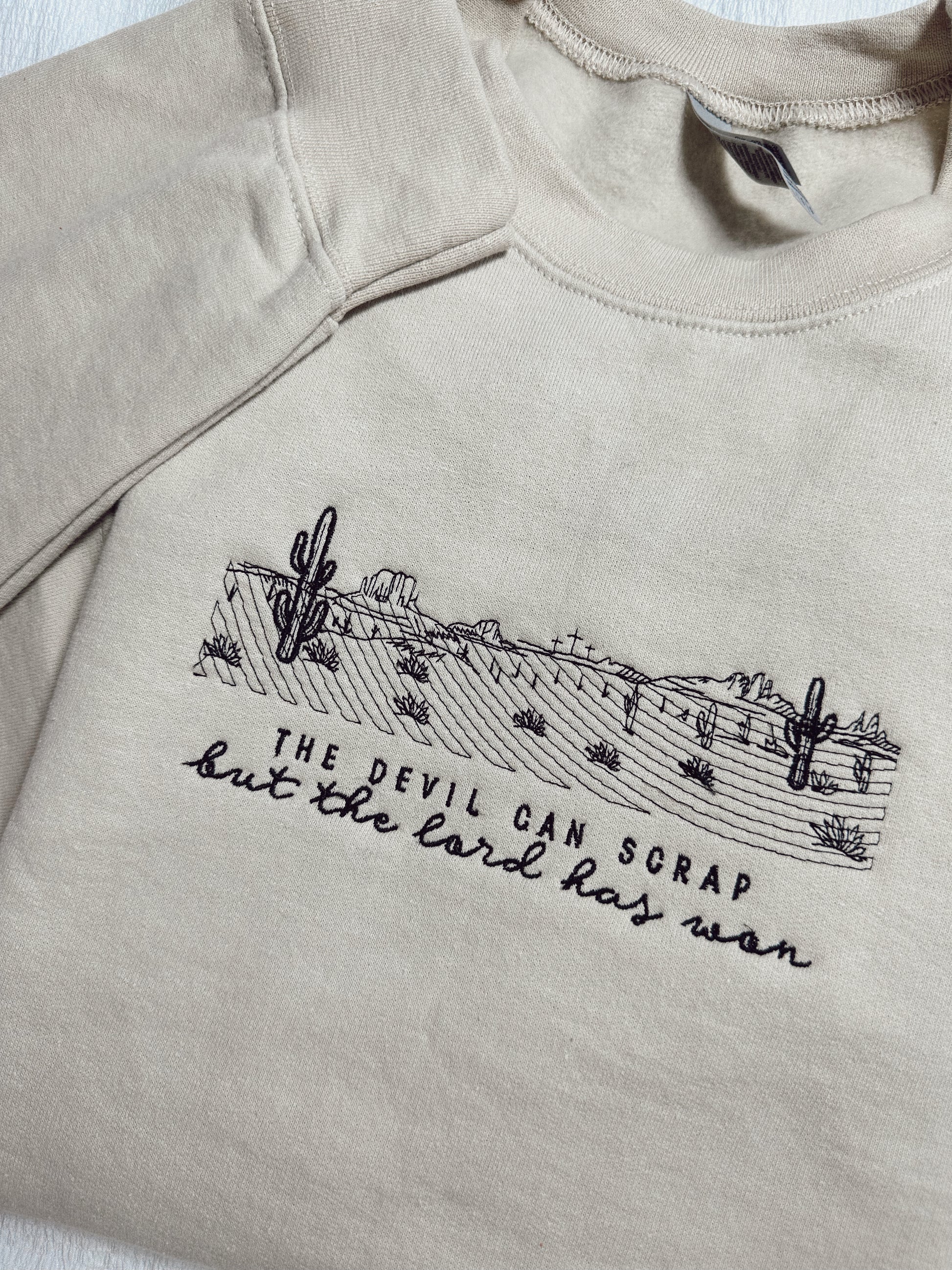 cotton/poly crewneck with embroidered design. unisex adult sizing. Tan Crewneck.